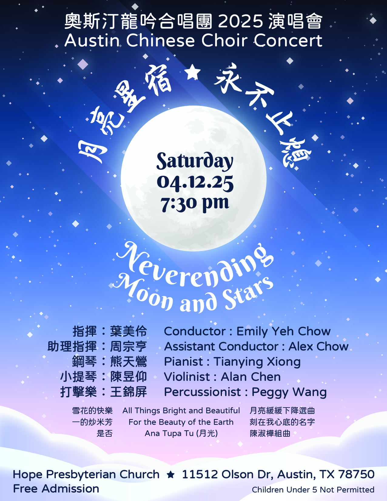 --------- April 12, Saturday 7:30 pm Austin Chinese Choir Concert at Hope Presbyterian Church (11512 Olson Drive, Austin, TX 78750) Austin Chinese Choir Concert Flyer