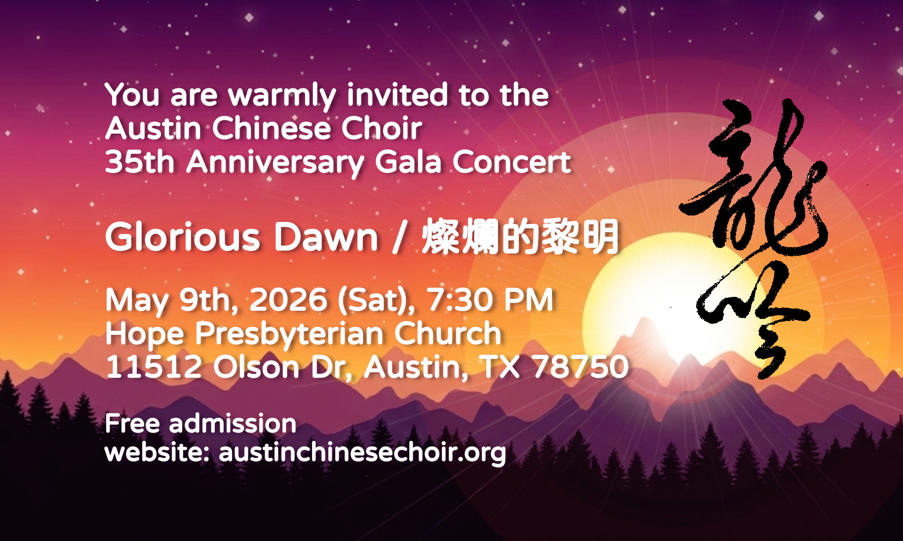 May 6, Saturday 7:30 pm - Austin Chinese Choir Concert at Austin Taiwanese Presbyterian Church (5300 Duval Road, Austin, TX 78727)